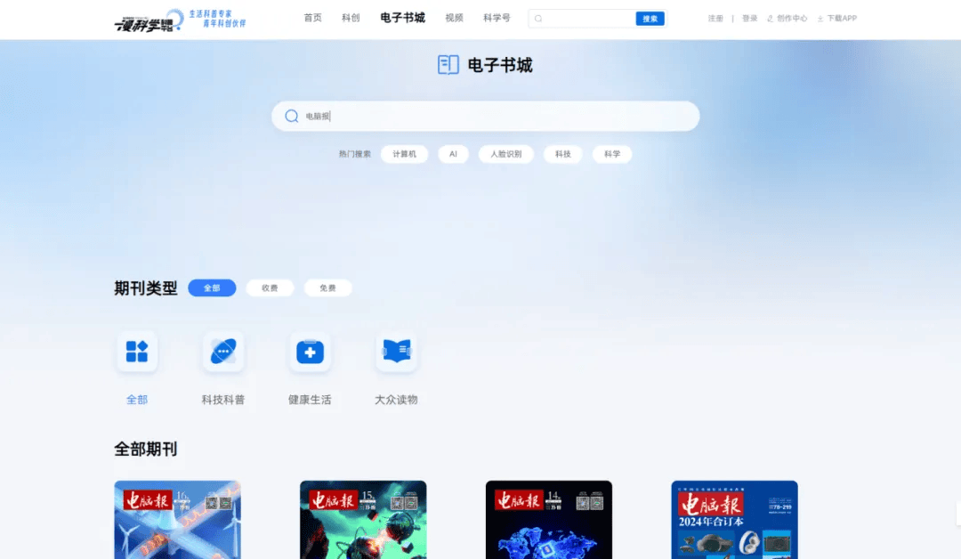进入漫科学官网www.mkexue.com,在上方选择电子书城,然后搜索电脑报,找到你需要阅读的这一期(新阅读器从2025年23期开始才有),点击在线阅读进入新版阅读模式。