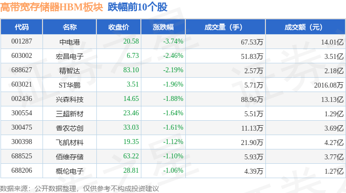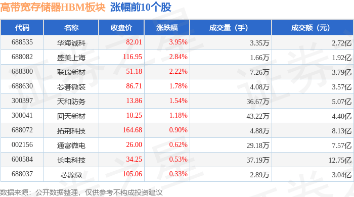 证券之星消息,7月22日高带宽存储器HBM板块较上一交易日上涨0.14%,华海诚科领涨。当日上证指数报收于3581.86,上涨0.62%。深证成指报收于11099.83,上涨0.84%。高带宽存储器HBM板块个股涨跌见下表: