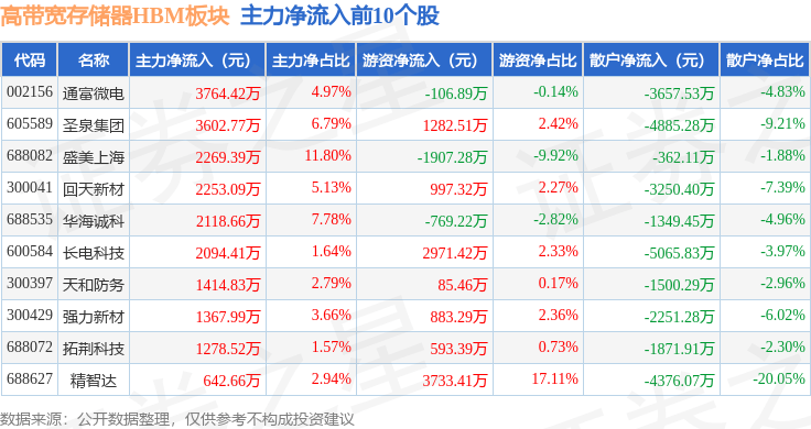从资金流向上来看,当日高带宽存储器HBM板块主力资金净流出4.31亿元,游资资金净流入2.48亿元,散户资金净流入1.82亿元。高带宽存储器HBM板块个股资金流向见下表: