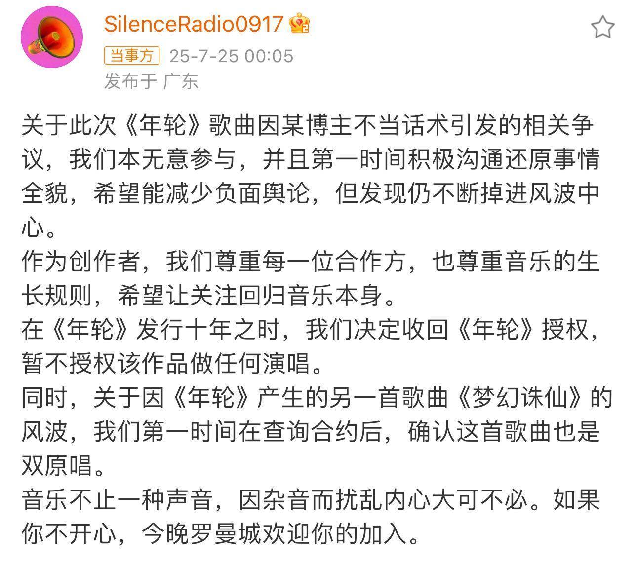 7月25日,汪苏泷方回应,关于此次《年轮》歌曲因某博主不当话术引发的相关争议,本无意参与,并且第一时间积极沟通还原事情全貌,希望能减少负面舆论,但发现仍不断掉进风波中心。同时宣布,“在《年轮》发行十年之时,我们决定收回《年轮》授权,暂不授权该作品做任何演唱。”