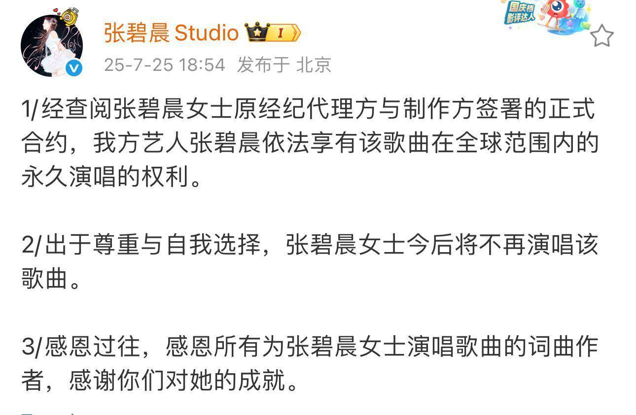 1、经查阅张碧晨女士原经纪代理方与制作方签署的正式合约,我方艺人张碧晨依法享有该歌曲在全球范围内的永久演唱的权利。