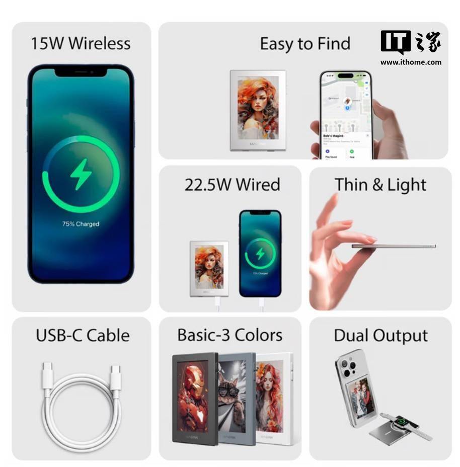 据悉,这款移动电源可以通过磁力吸附在 iPhone 上等设计背部,配有一块四色彩色墨水屏,支持利用 AI 随机生成各种主题壁纸,同时也支持作为提醒事项单、登机牌等使用。