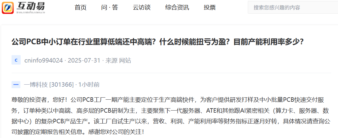 上证报中国证券网讯 一博科技8月5日在互动平台回答投资者提问时表示,公司PCB工厂一期产能主要定位于生产高端快件,为客户提供研发打样及中小批量PCB快速交付服务,订单种类以中高端、高多层的PCB研制为主,主要聚焦下一代服务器、ATE和其他跟AI紧密相关(算力卡、服务器、数据中心)的复杂PCB产品生产。公司称:该工厂自试生产以来,营收、利润、产能利用率等财务指标正逐月好转。