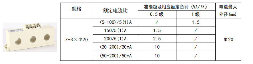 AKH-0.66/Z 型系列三相导轨式电流互感器:为组合式 CT 三相一体,用于小空间配电柜,采用 DIN35mm 导轨式安装结构,如 AKH-0.66/Z-3*Φ20,额定电流比 100A/5A,准确级 1 级,额定负荷 1.5VA,穿心匝数 1 匝。