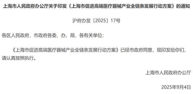 近日,市政府办公厅印发的《上海市促进高端医疗器械产业全链条发展行动方案》上网公开。