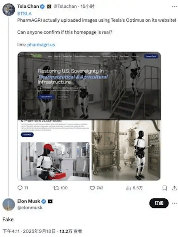 消息面上,针对近期有消息称美国植物基制药企业PharmAGRI与特斯拉签署意向书,计划在自营的农业产业链、原料药合成及处方药生产环节部署多达1万台Optimus Gen3+人形机器人一事,马斯克在社交媒体上回复称:“假的。”