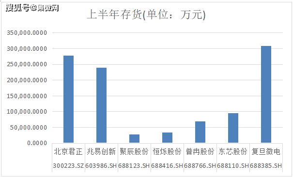 从存货跌价准备合计来看,上半年复旦微电存货跌价最多达54826.108万元,兆易创新存货跌价达28738.94万元,北京君正存货跌价达26353.07万元,东芯股份存货跌价为17483.32万元,普冉股份存货跌价为12500万元,恒烁股份存货跌价为8894.59万元,聚辰股份存货跌价为7460.26万元。