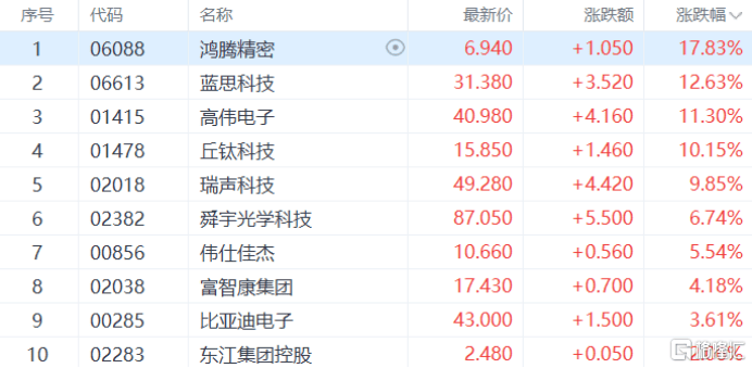 苹果概念股强势,鸿腾精密涨超17%,蓝思科技涨超12%,高伟电子、丘钛科技、瑞声科技等跟涨。