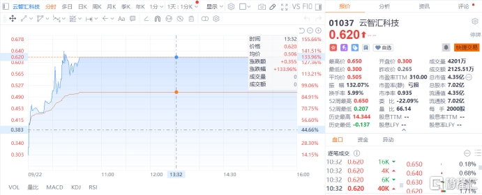云智汇科技涨133.96%,报0.62港元。
