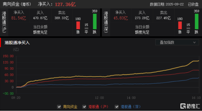 今日,南向资金净买入127.36亿港元,其中港股通(沪)净买入81.54亿港元,港股通(深)净买入45.83亿港元。