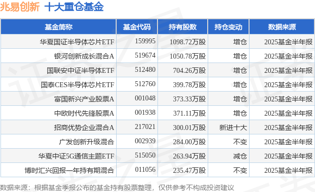 根据2025基金半年报公募基金重仓股数据,重仓该股的公募基金共301家,其中持有数量最多的公募基金为华夏基金的华夏国证半导体芯片ETF。华夏国证半导体芯片ETF目前规模为254.21亿元,最新净值1.7032(9月19日),较上一交易日下跌1.71%,近一年上涨124.19%。该公募基金现任基金经理为赵宗庭。赵宗庭在任的基金产品包括:华夏沪深300ETF联接A,管理时间为2017年4月17日至今,期间收益率为50.87%;华夏沪深300ETF,管理时间为2017年4月17日至今,期间收益率为52.21%;华夏野村日经225ETF,管理时间为2019年6月12日至今,期间收益率为67.53%;