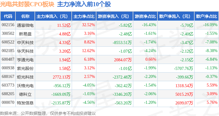 从资金流向上来看,当日光电共封装CPO板块主力资金净流出3.09亿元,游资资金净流出6628.04万元,散户资金净流入3.75亿元。光电共封装CPO板块个股资金流向见下表: