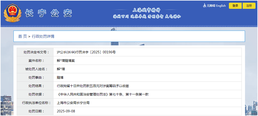 记者查询上海市公安局长宁分局相关信息发现,今年9月8日,一名叫做“解某增”的人士,因赌博受到了行政处罚。按照《中华人民共和国治安管理处罚法》第七十条、第十一条第一款,他被行政拘留十日、罚款500元,并对涉案筹码予以收缴。