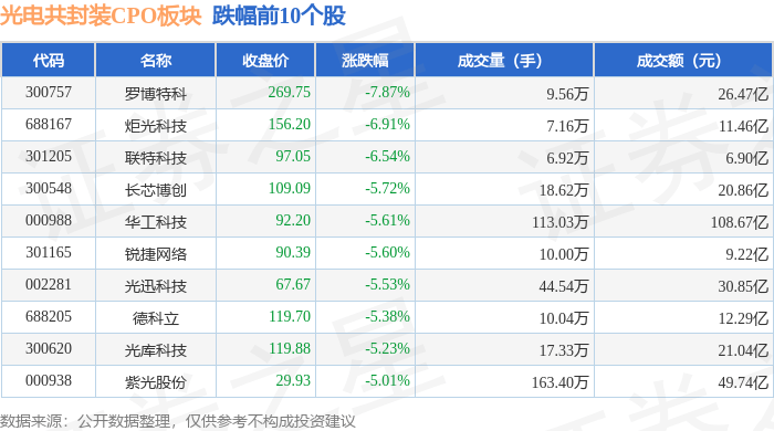 证券之星消息,9月26日光电共封装CPO板块较上一交易日下跌3.17%,罗博特科领跌。当日上证指数报收于3828.11,下跌0.65%。深证成指报收于13209.0,下跌1.76%。光电共封装CPO板块个股涨跌见下表: