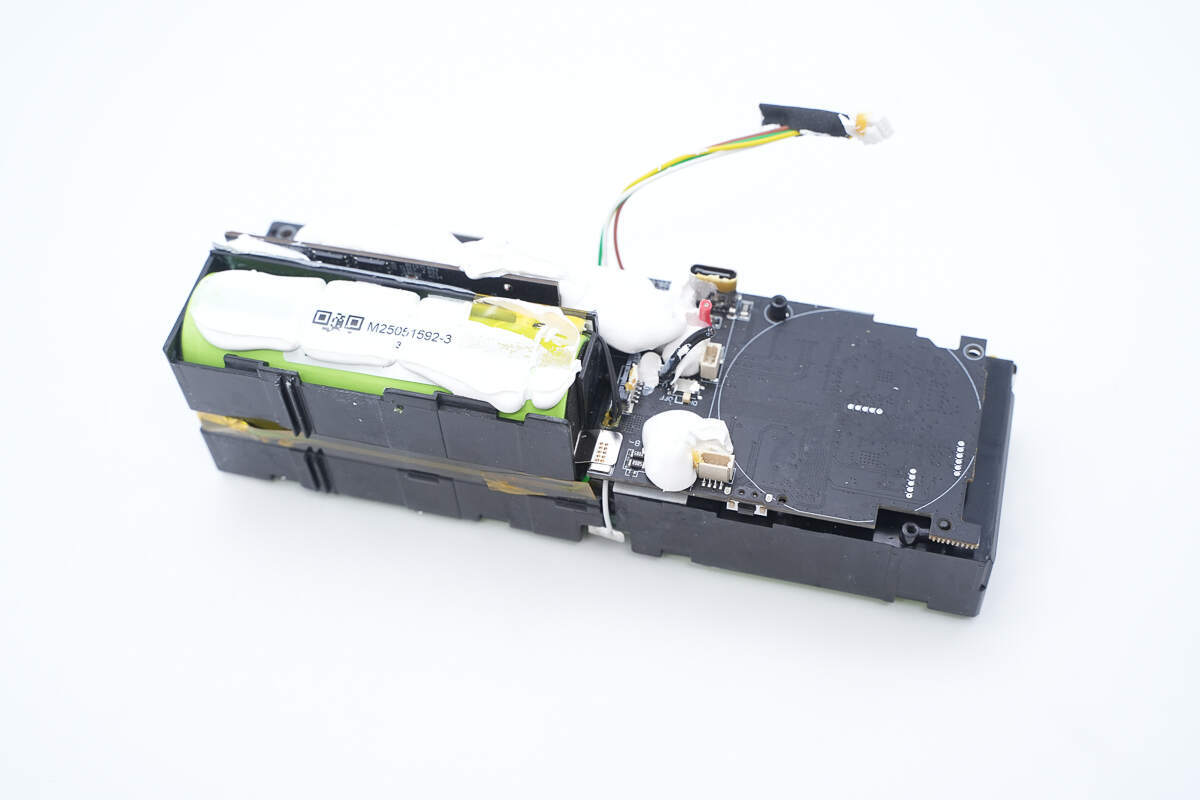 电芯和PCB小板所在区域大量填充白胶加固保护,电芯右端固定有热敏电阻进行温度监控。