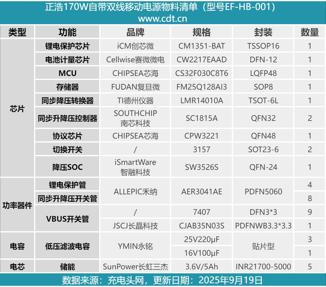 最后附上正浩170W自带双线移动电源的核心器件清单,方便大家查阅。