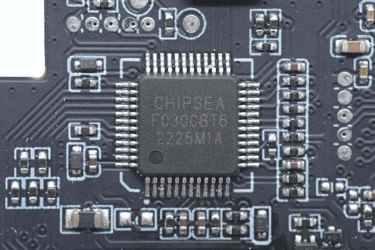 用于整机控制的MCU来自芯海科技,型号CS32F030C8T6,芯片内置48MHz主频 ARM Cortex-M0 CPU,集成64KB FLASH和8KB SRAM,具备两个UART接口,两个SPI接口和两个I2C接口,采用LQFP48封装。