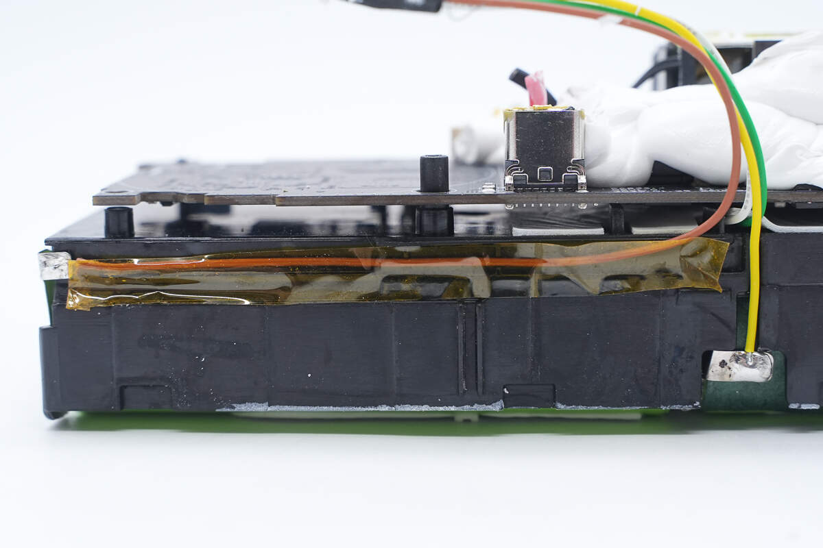 拉拉线模块同样使用螺丝进行固定,USB-C2挂绳线线芯焊接于绿色独立小板背面,线芯打胶水保护。