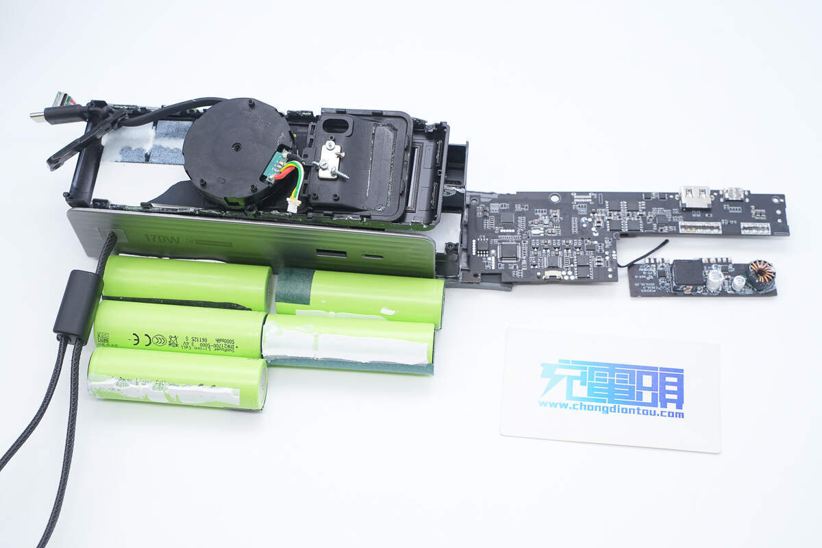 充电头网通过拆解了解到,移动电源内置电池组采用的是五颗长虹三杰INR21700-5000锂电池,25000mAh容量为产品续航能力提供强力支持,此外通过了国家CCC强制认证,品质有保证。并且配备创芯微CM1351-BAT锂电保护方案以及热敏电阻进行温度监控,电池健康度以及温度可视化反馈,使用更安全放心。