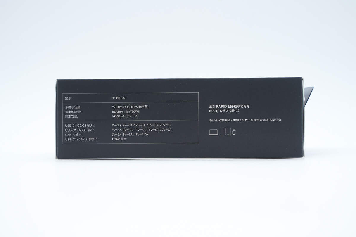 另一侧配置1A1C快充接口和USB-C2挂绳线,壳体上印有170W、25000mAh/90Wh以及可携带上飞机标识。