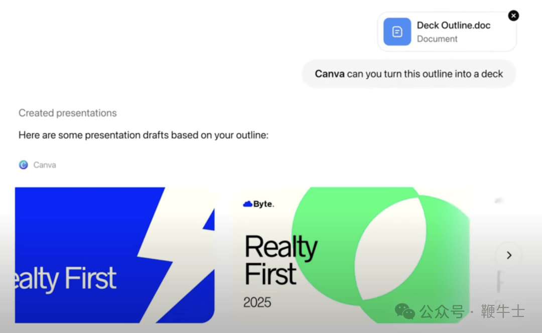 在现场演示中,OpenAI展示了App SDK的威力。工作人员直接让ChatGPT调用 Canva,为一家遛狗公司生成四款海报,接着一句话让它自动生成推介PPT,全程无缝衔接。