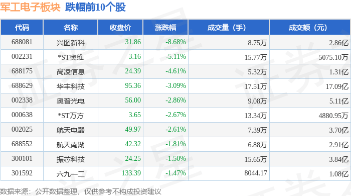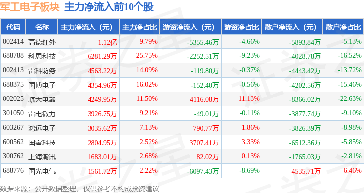 从资金流向上来看,当日军工电子板块主力资金净流出3.97亿元,游资资金净流入1.42亿元,散户资金净流入2.55亿元。军工电子板块个股资金流向见下表: