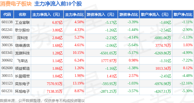 从资金流向上来看,当日消费电子板块主力资金净流入2.6亿元,游资资金净流出2.04亿元,散户资金净流出5631.83万元。消费电子板块个股资金流向见下表:
