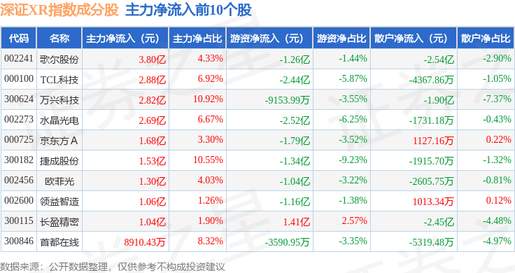 资金流向方面,深证XR(970046)指数成份股当日主力资金净流出合计2623.3万元,游资资金净流出合计1.95亿元,散户资金净流入合计2.21亿元。成份股资金流向详情见下表: