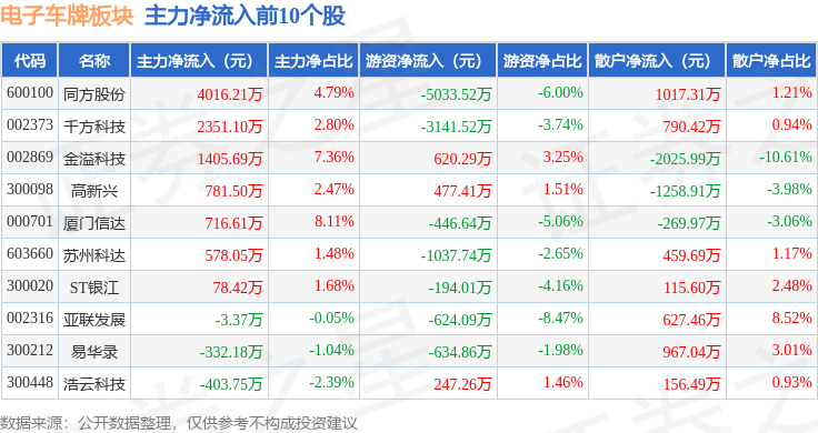从资金流向上来看,当日电子车牌板块主力资金净流出1201.26万元,游资资金净流出4462.72万元,散户资金净流入5663.98万元。电子车牌板块个股资金流向见下表: