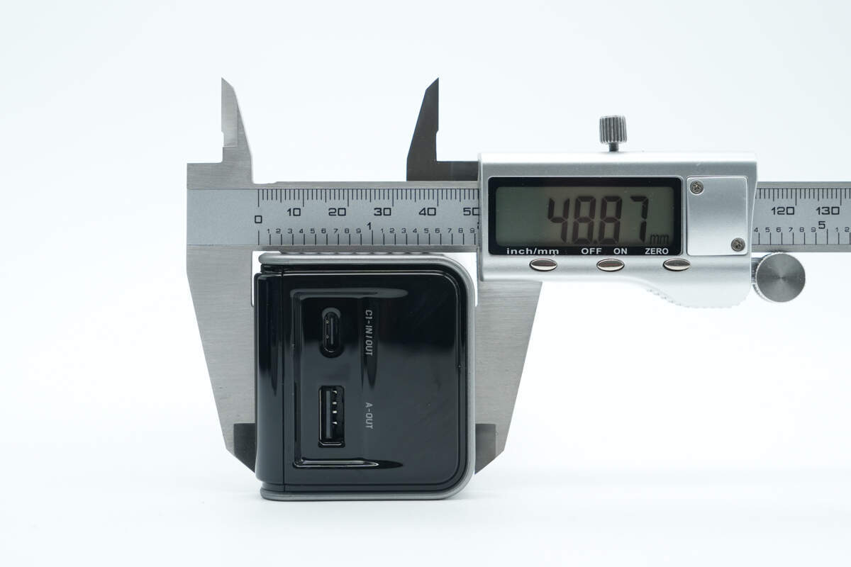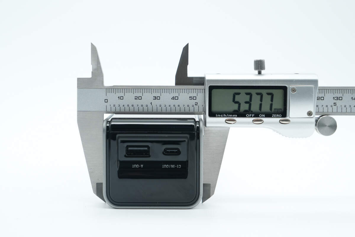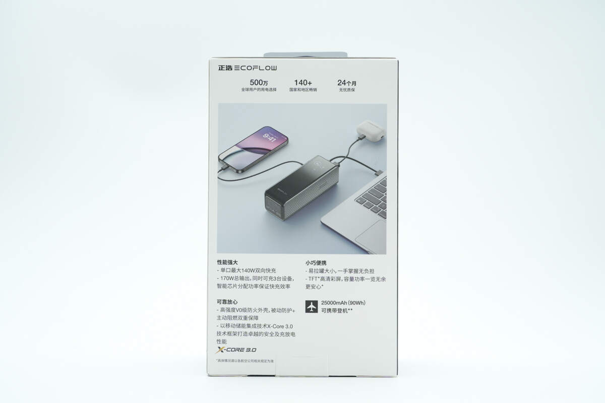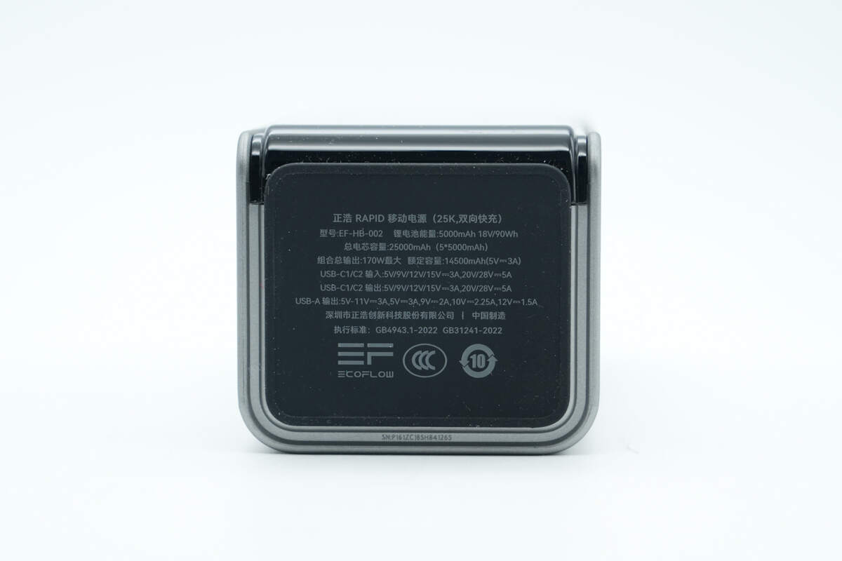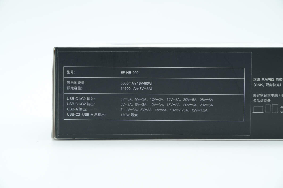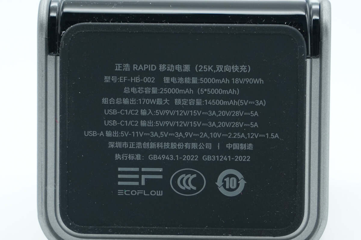 另一侧配置USB-C2双向快充接口,接口右侧壳体上印有170W、25000mAh/90Wh以及可携带上飞机标识。
