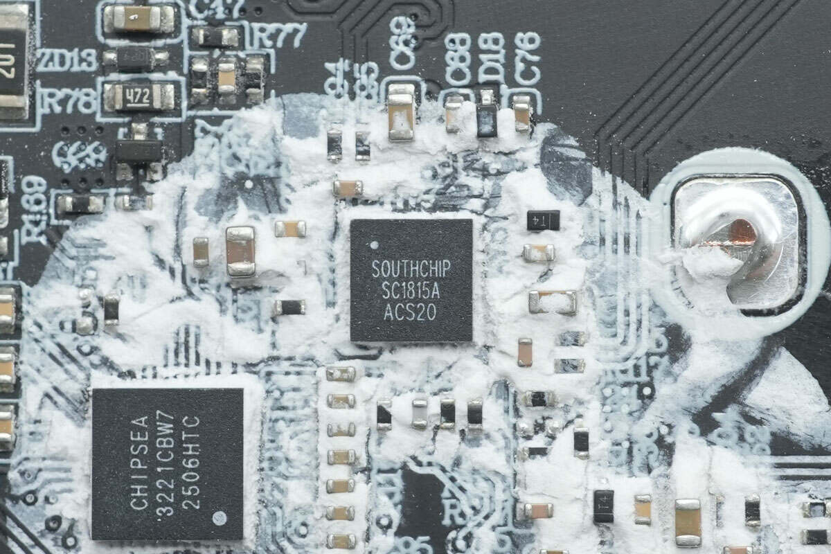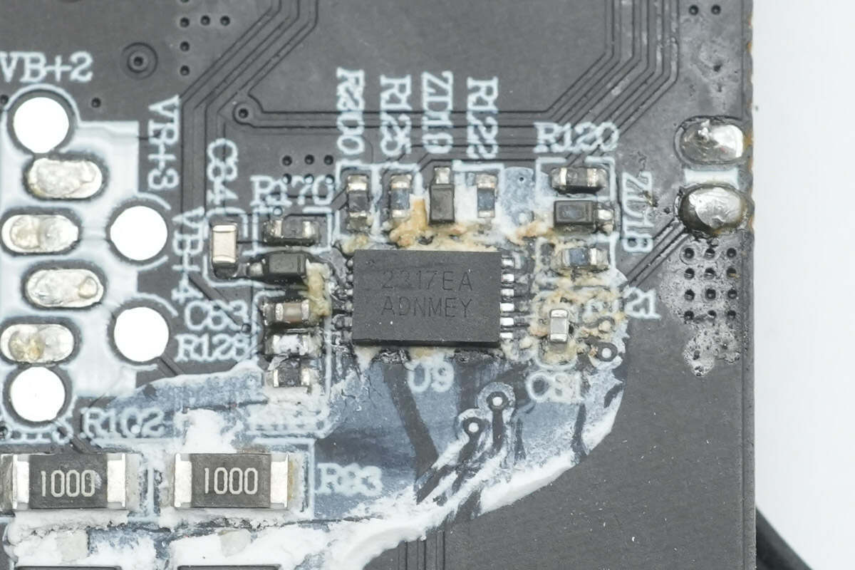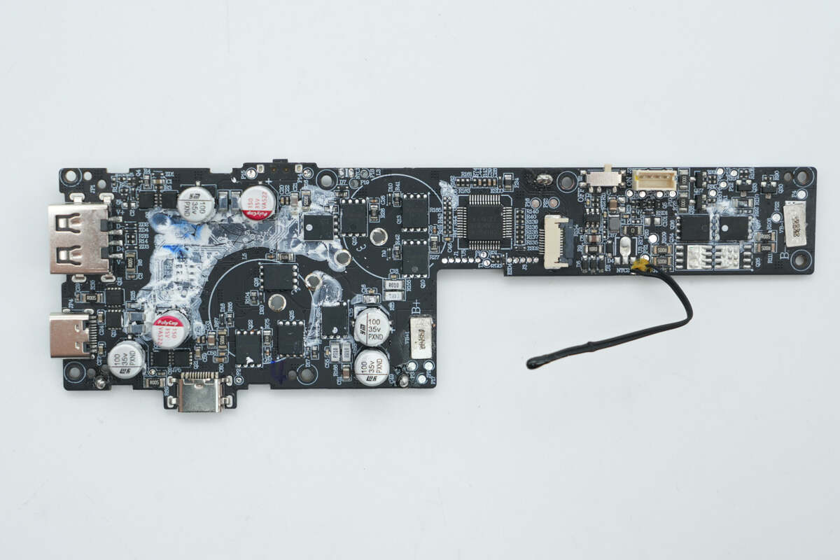 将PCB板上白胶清理掉,板子正面设有锂电保护管、MCU、同步降压转换器、同步升降压开关管、滤波固态电容以及VBUS开关管。