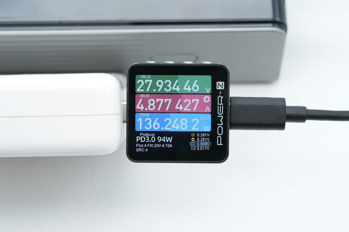 使用苹果140W充电器给移动电源充电,测得充电功率约为136.25W,成功开启28V5A 140W PD快充。