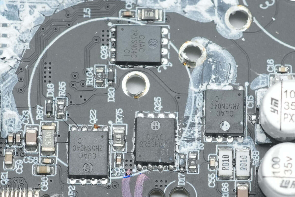 拆掉电感,底部四颗同步升降压开关管来自长晶科技,型号CJAC2R5SN04C,NMOS管,耐压40V,导阻2mΩ,采用PDFNWB5*6-8L封装。