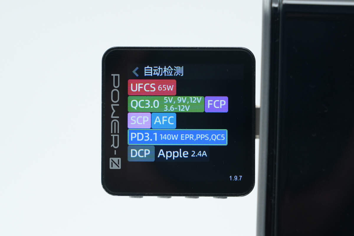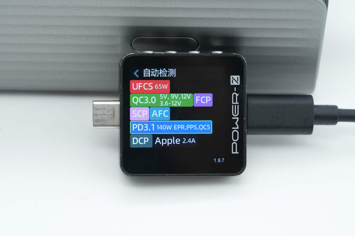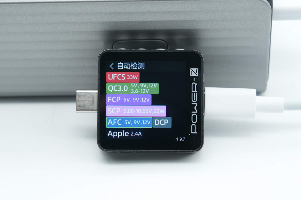测得USB-A口支持UFCS、QC3.0、FCP、SCP、AFC、DCP、Apple 2.4A充电协议。
