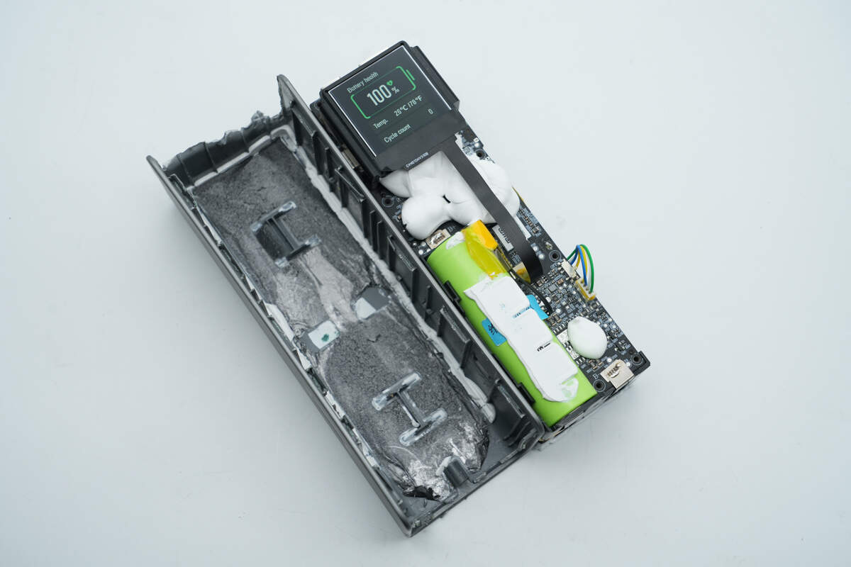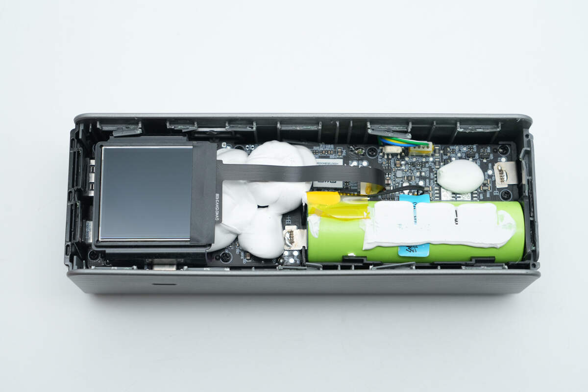 此外采用南芯科技SC1815A升降压控制器搭配芯海科技CPW3221协议芯片方案实现2C1A接口快充控制。芯海科技MCU搭配复旦微存储器为丰富屏显功能提供支持,德州仪器降压方案进行供电。壳体上贴有石墨散热贴纸,器件、电芯打胶加固,做工可靠。