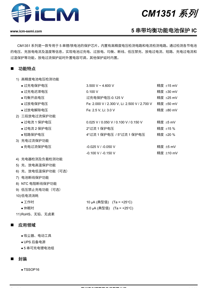 创芯微CM1351具有15mV电池过充保护精度,支持三段放电过流保护,支持充电过流保护功能,支持电池单体接线断线保护和NTC热敏电阻断线保护功能,能够为多串锂电池组提供完善的保护功能。