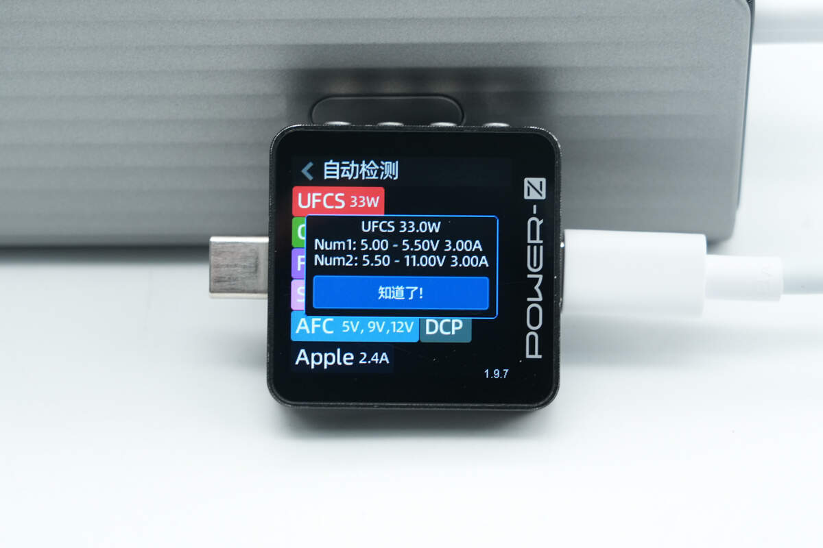 测得UFCS融合快充具备5-5.5V3A、5.5-11V3A两组电压档位。