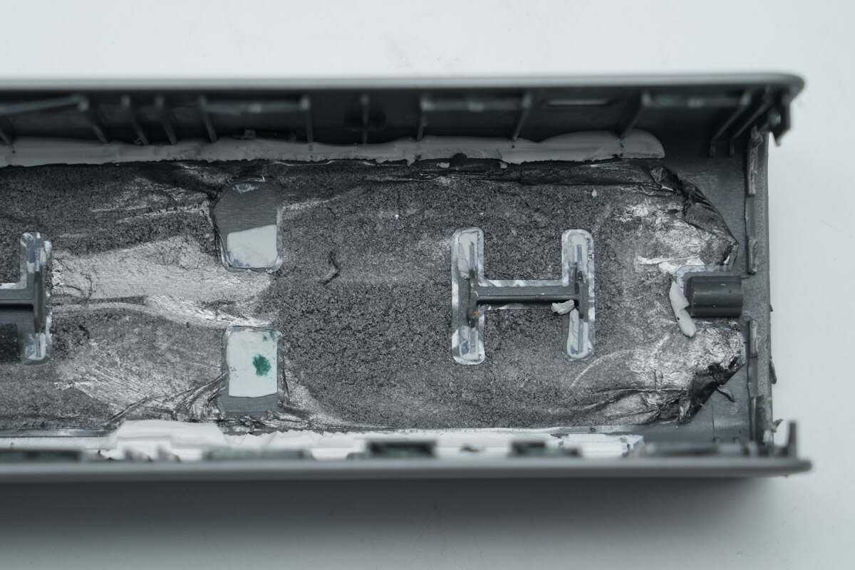 将移动电源正面装饰板拆下,内侧贴有石墨散热贴纸,并做了绝缘处理。