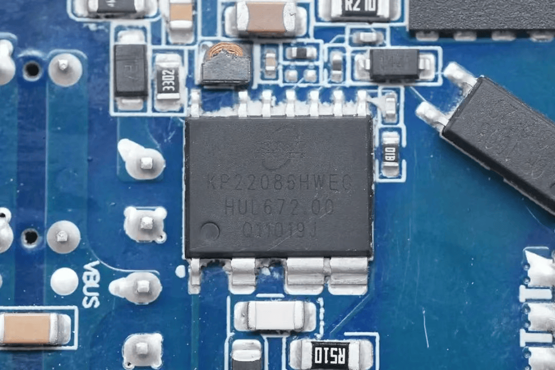 开关电源主控芯片来自必易微,型号 KP22086H,这是一款集成 E-GaN 的高频高性能准谐振模式交直流转换功率开关。芯片集成高压启动电路,可获得快速启动功能和超低的工作电流,实现小于 30mW 的超低待机功耗。