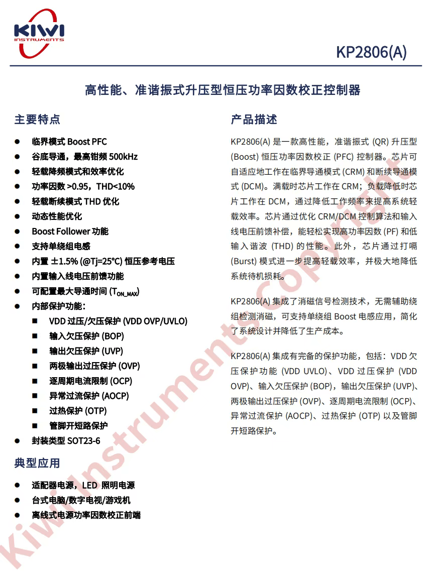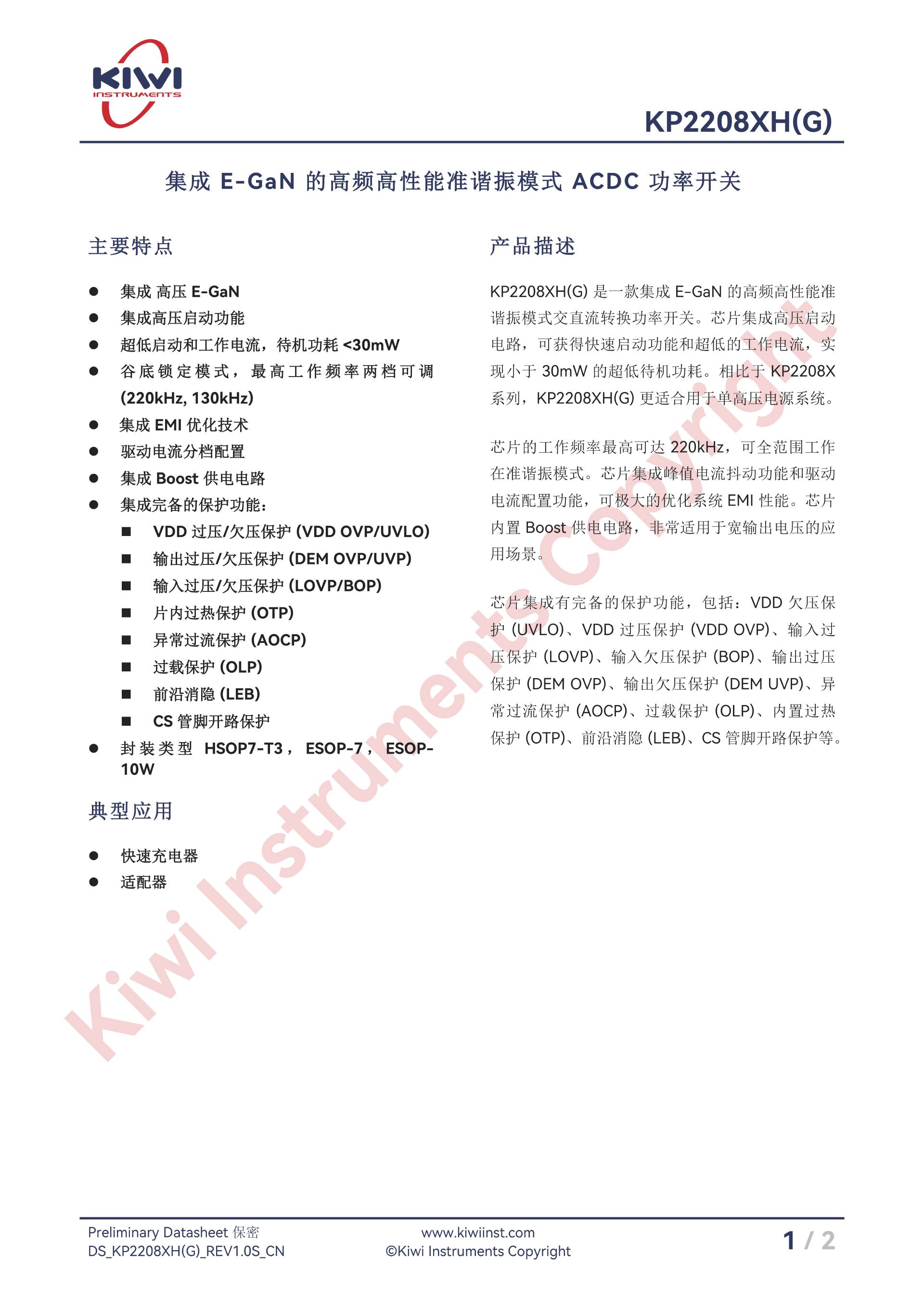 KP2208XH 的工作频率最高可达 220kHz,可全范围工作在准谐振模式。芯片集成峰值电流抖动功能和驱动电流配置功能,可极大的优化系统 EMI 性能。芯片内置 Boost 供电电路,非常适用于宽输出电压的应用场景。芯片采用 HSOP7-T3,ESOP-7,ESOP-10W 等不同封装,满足 20W~120W 的应用需求。