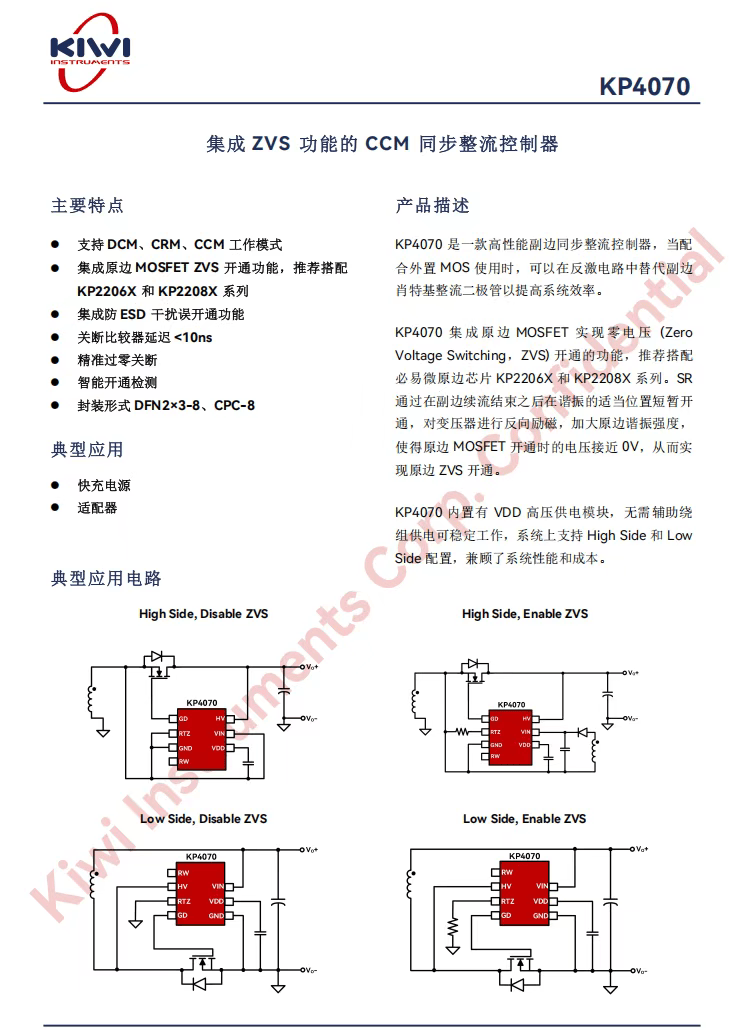 KP4070 集成原边 MOSFET 实现零电压开通的功能,推荐搭配必易微原边芯片 KP2206X 和 KP2208X 系列。SR 通过在副边续流结束之后在谐振的适当位置短暂开通,对变压器进行反向励磁,加大原边谐振强度,使得原边 MOSFET 开通时的电压接近 0V,从而实现原边 ZVS 开通。