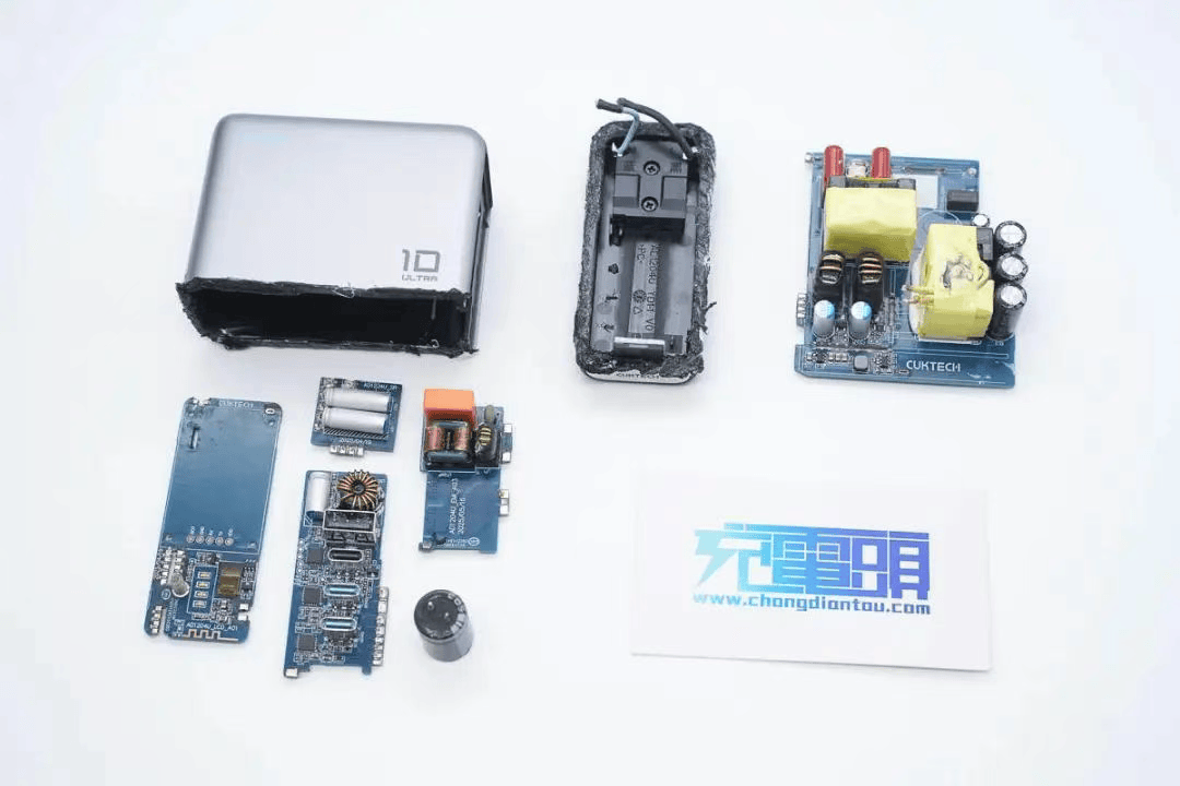 USB 接口采用芯潭微同步降压方案进行二次降压,慧能泰 HUSB362 和南芯科技 SC2021A 协议芯片控制接口输出。此外采用昂瑞微 OM6621Px 蓝牙 SOC 方案实现蓝牙连接以及屏显功能等。全部的滤波电容由东佳提供。产品内部除模块主板外,还额外设有四块 PCB 小板进行焊接组成,外层覆盖铜散热片的同时,正背面还填充高导热有机硅胶,搭配自研算法与 NTC 硬件,保障充电安全。