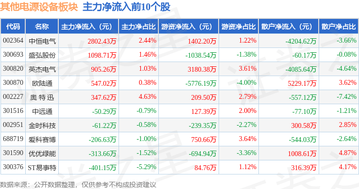 从资金流向上来看,当日其他电源设备板块主力资金净流出22.05亿元,游资资金净流入2.29亿元,散户资金净流入19.76亿元。其他电源设备板块个股资金流向见下表: