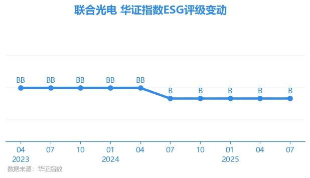 日前,华证指数公布了新一期(2025年7月31日)的ESG评级结果,联合光电(300691.SZ)获得B评级(华证指数评级为C起至AAA九档,C为最低档,AAA为其最高一级评级/AA为其第二档),上一期(2025年4月30日)ESG评级为B。本期ESG评级在529家电子设备、仪器和元件行业A股上市公司中排名第349(上一期排名第364)。