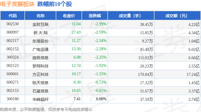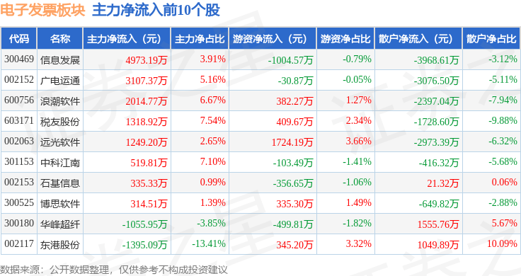 从资金流向上来看,当日电子发票板块主力资金净流出1.94亿元,游资资金净流出403.81万元,散户资金净流入1.98亿元。电子发票板块个股资金流向见下表: