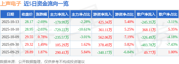 证券之星消息,截至2025年10月13日收盘,上声电子(688533)报收于28.17元,下跌2.69%,换手率1.72%,成交量2.81万手,成交额7878.99万元。