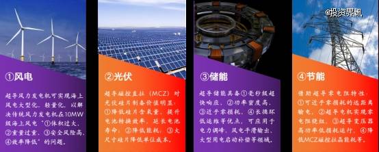 能源:超导技术的应用可实现风电设备的大型化与轻量化、提升光伏单晶硅光电转化效率并延长光伏组件寿命、提高储能效率、极低损耗电流传输。