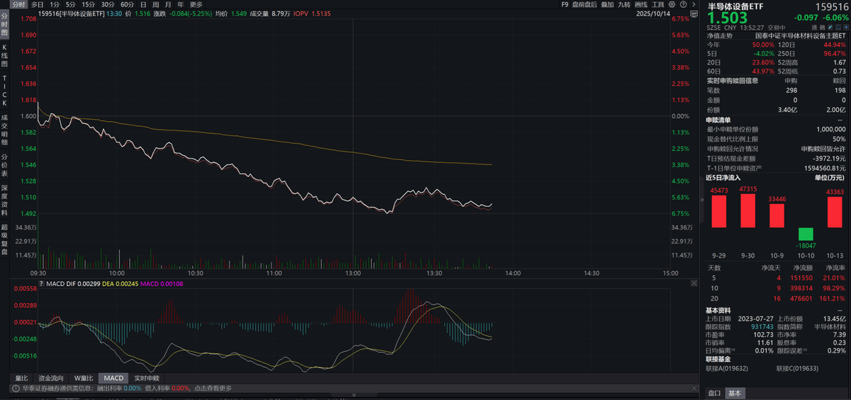 10月14日,在前期连续上涨后,半导体设备ETF(159516)今日由涨转跌,调整超6%。