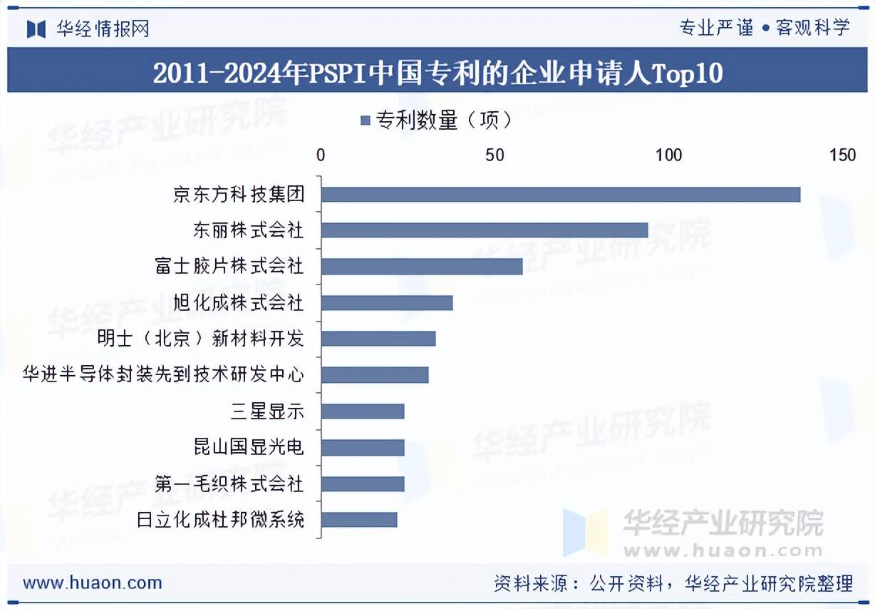 据统计,2011-2024年,京东方科技集团所申请的PSPI专利数量为138项,大幅领先国内外其他企业申请人;第二名和第三名依次为日本东丽株式会社、富士胶片株式会社,专利数量分别为94和58项;其余企业申请人在专利申请数量上并没有明显的差异,数量范围基本在16~38项。