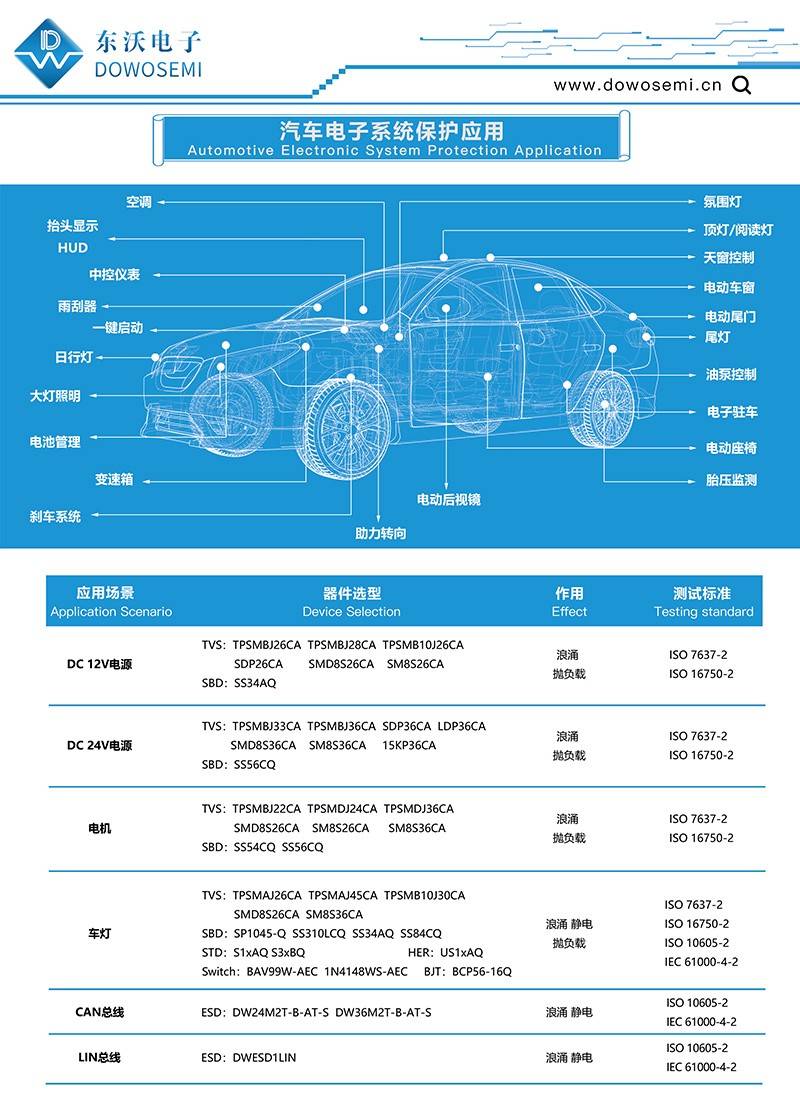 2)车规级ESD保护二极管:DW05D-B-AT-S、DW05DLC-B-AT-S、DW05D5BC-B-AT-E、DW05M2T-B-AT-S、DW05M2UC-AT-E、DW05DF-BH-AT-E、DW05DRF-B-AT-E、DW05-4R2P-AT-S、DW05-6R1N-AT-E、DW12D5-B-AT-S、DW12DF-B-AT-E、DW15D-B-AT-S、DW15M2T-B-AT-S、PESD1LIN、DW24D-B-AT-S、DW24D5-B-AT、DW24M2T-B-AT-S、NUP2105L、PESD1CAN、DW36D-B-AT-S、DW36M2T-AT-S、DW36M2T-B-AT-S……